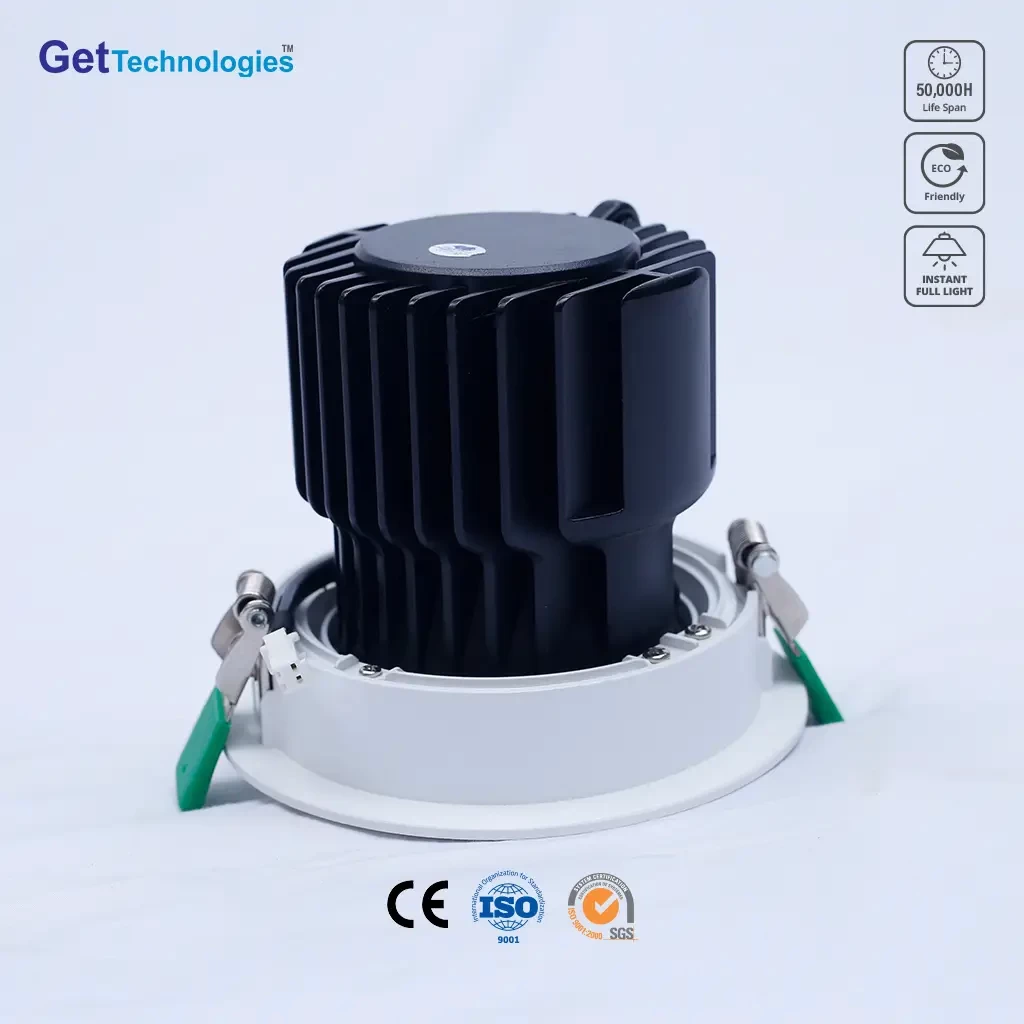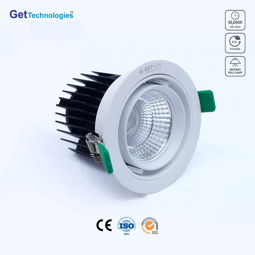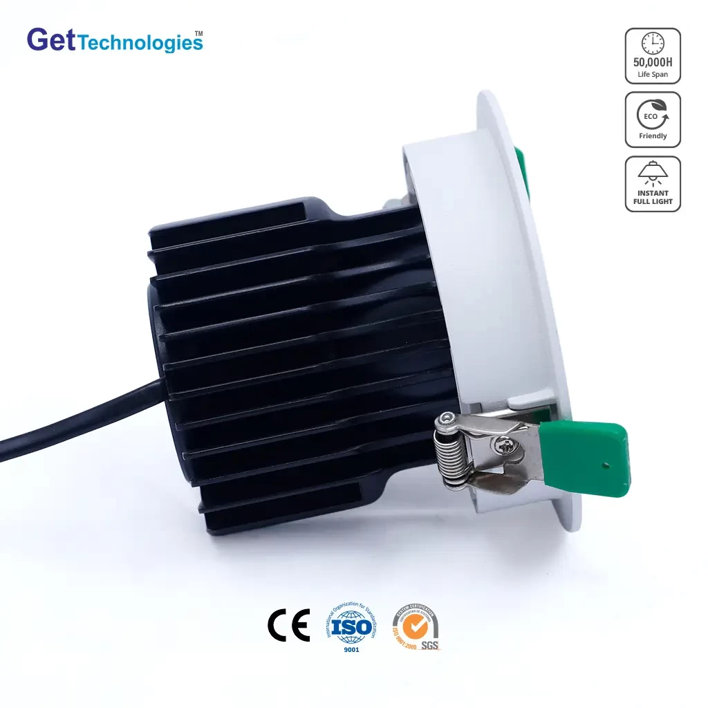 Get Technologies LED COB Spot light has the traditional down light advantages, its special advantage place is easy to maintain, more energy-efficient, low heat and long service life. Easy to recess in any ceiling or flat panel. With separable connector, easy to install and replace. Perfect frame and side design, no leakage, protect eyesight. With a locking design on connector for safety concern. LED down lights structure is simple, there is a major component of the lamp body shell, power supply and LEDs